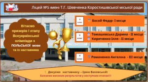 Вітаємо призерів І етапу Всеукраїнської олімпіади з польської мови та їх наставницю!